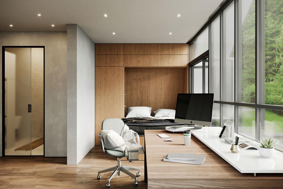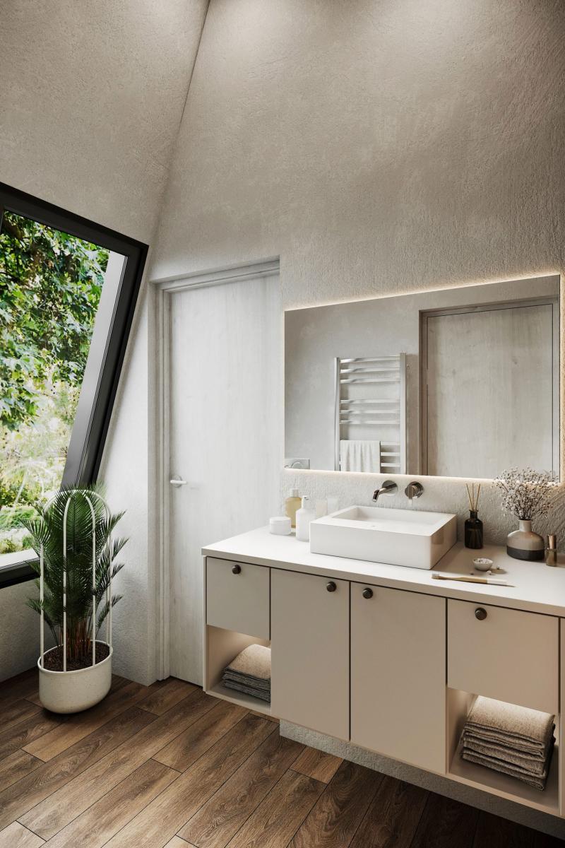 - Bath: Frosted glass shower, wall mounted toilets, sinks, faucets, and custom vanities.