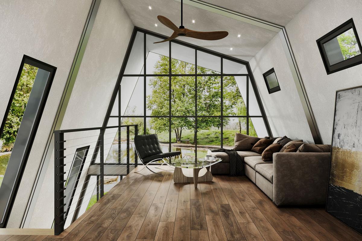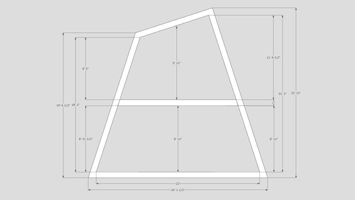 - Downstairs is 38’ long x 18’ wide with high side ceilings of 26’ ½” and low side ceilings of 19’ 10”