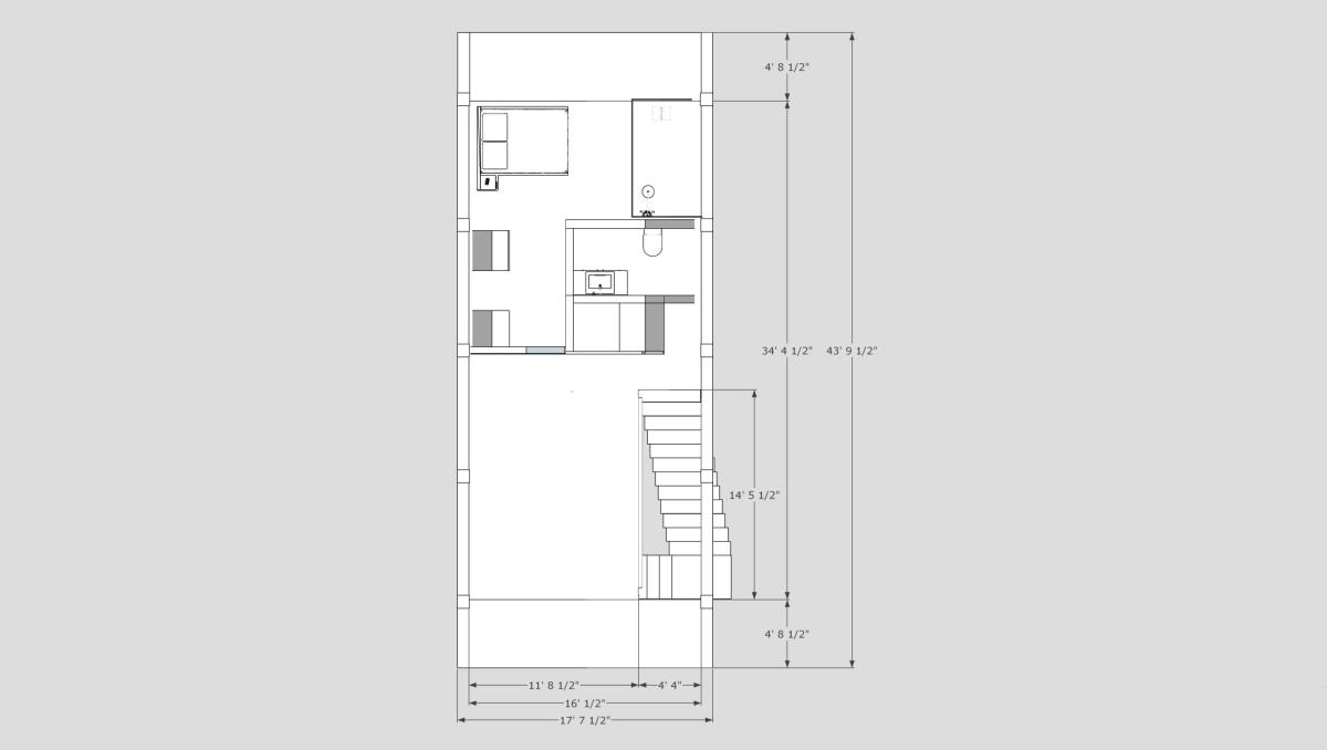 - Upstairs is 34’7” long x 16’ wide with high side ceilings of 11’4 ½” x low side of 8’ 4 ½.’