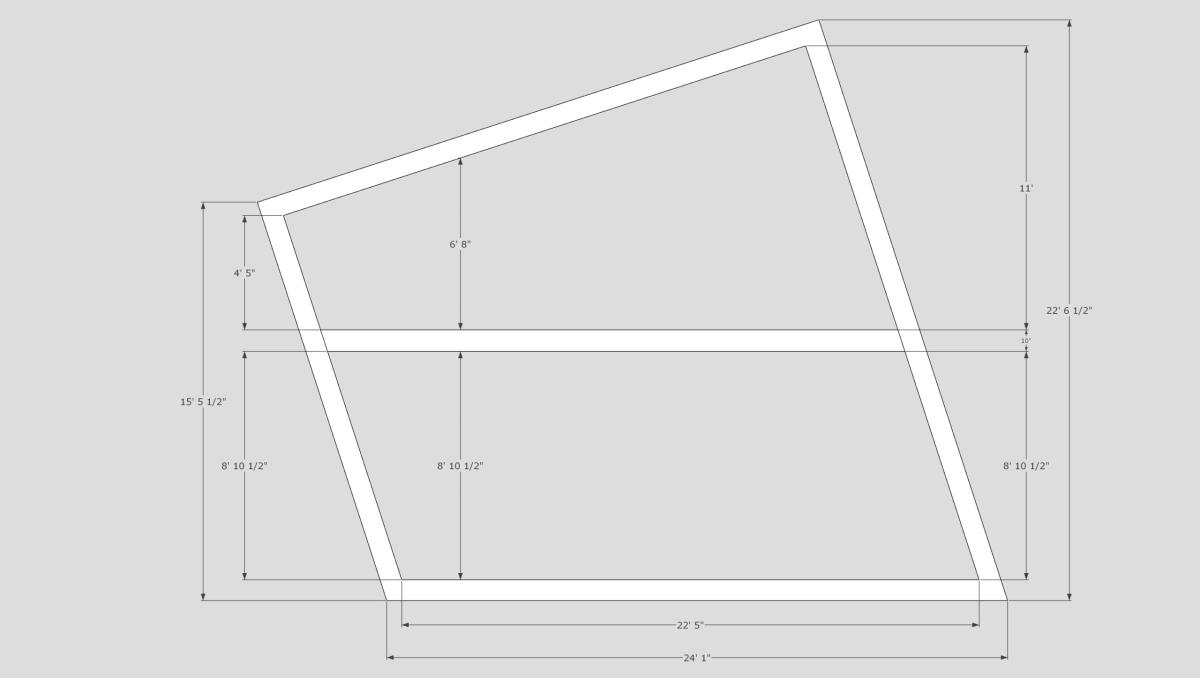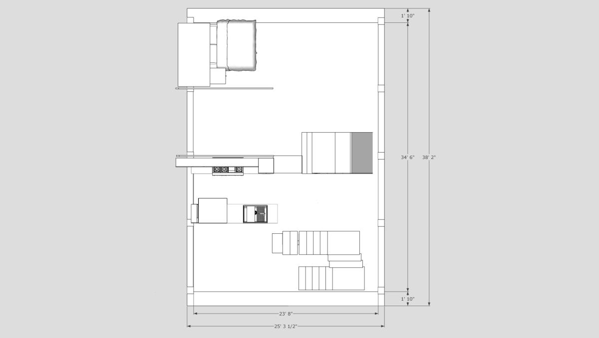 Downstairs is 38’ long x 24’ 2” wide with high side ceilings of 22’ 10” and low side ceilings of 15’ 8.”