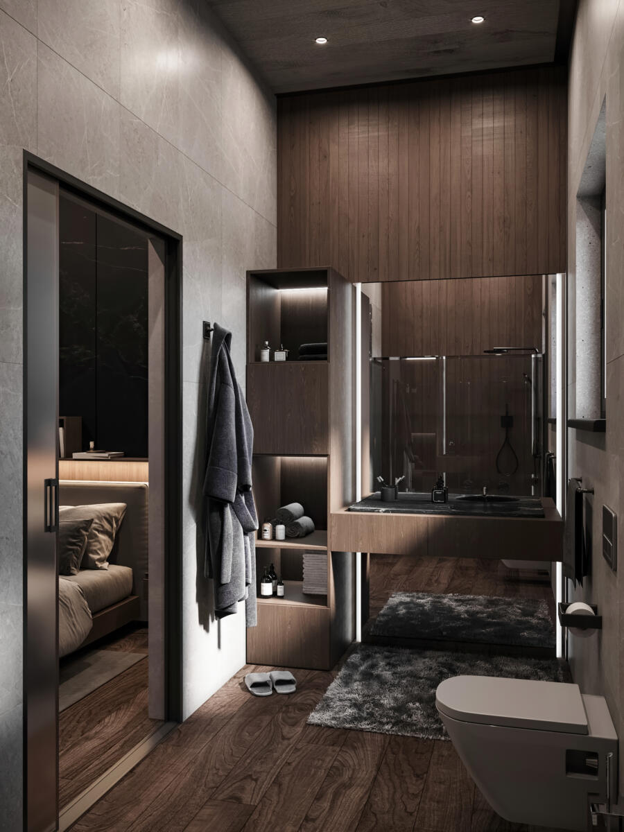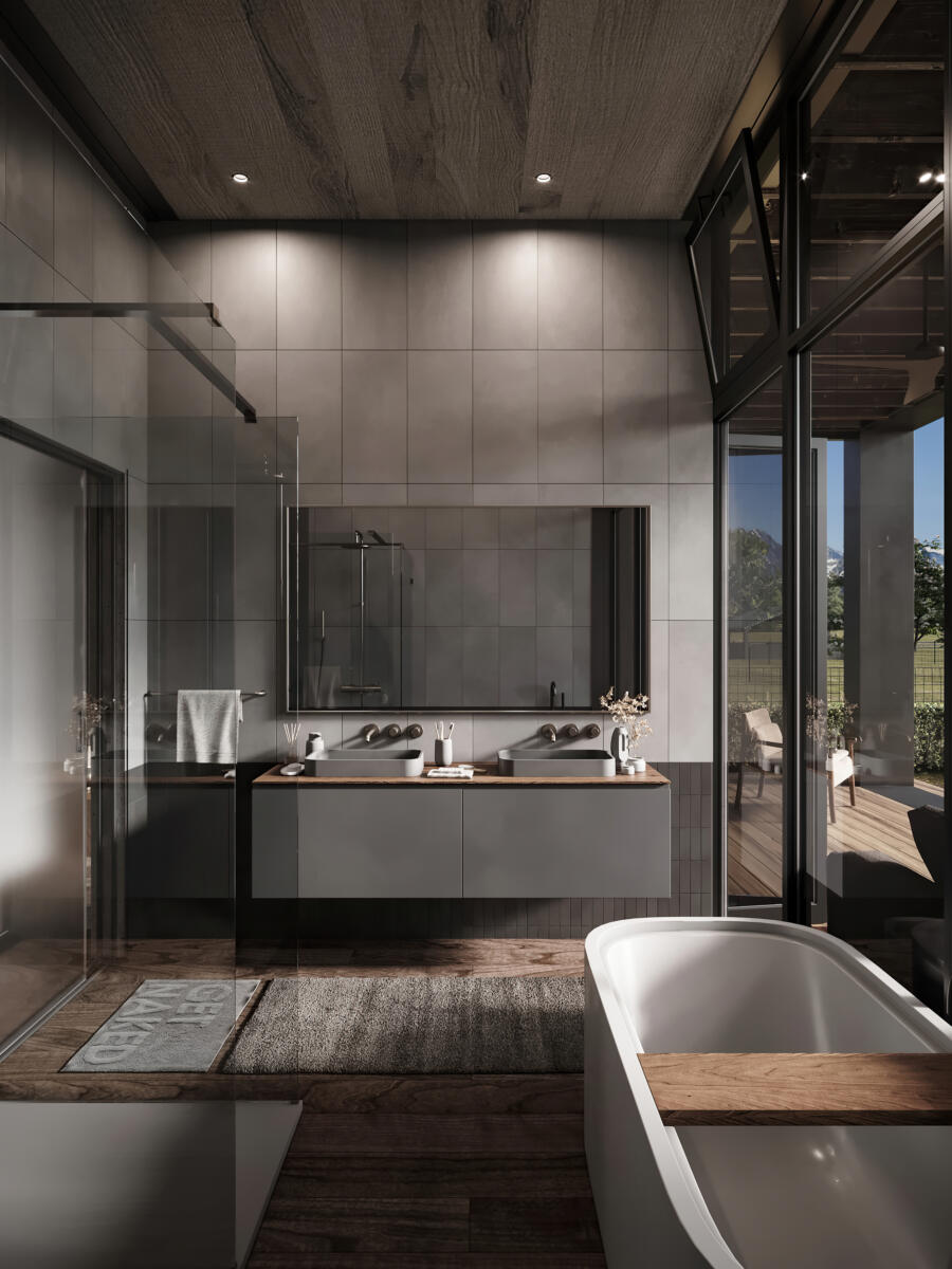 - Each Bath: Frosted glass shower, wall mounted toilets, sinks, faucets, and custom vanities.