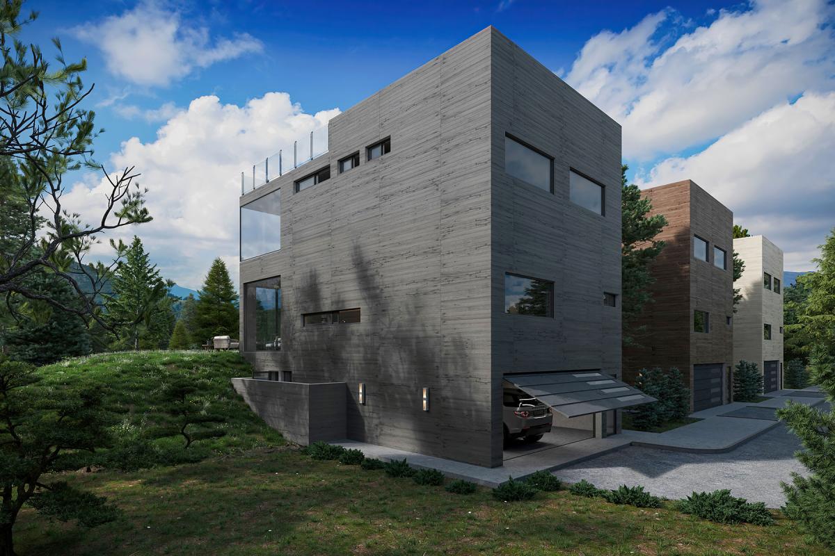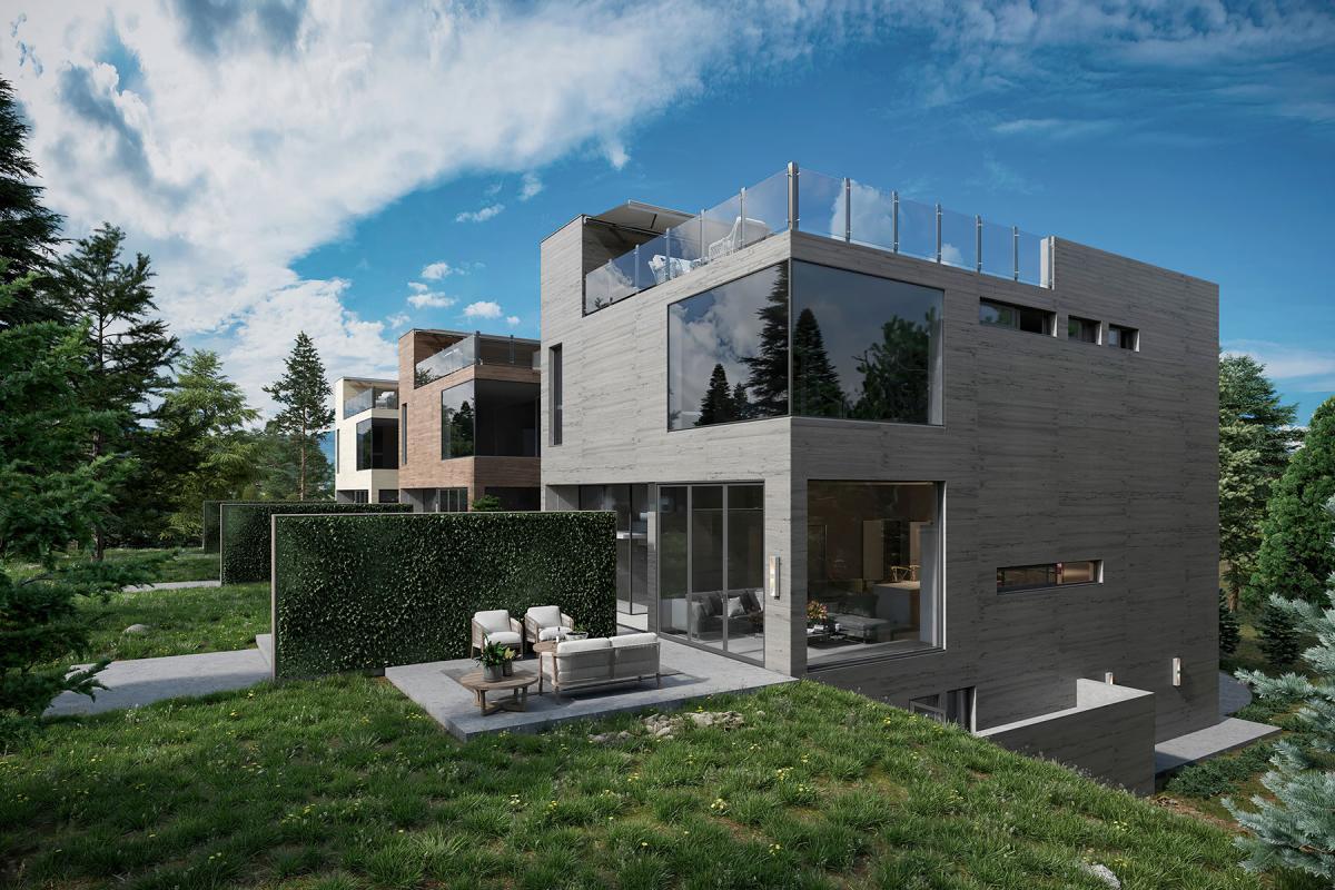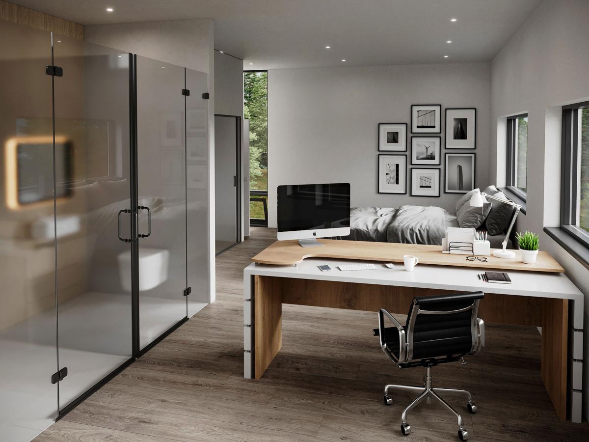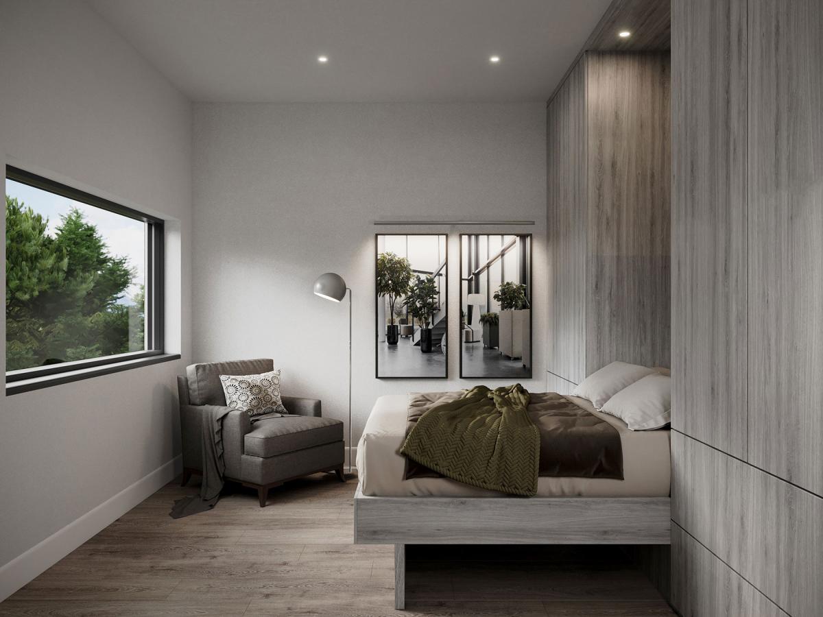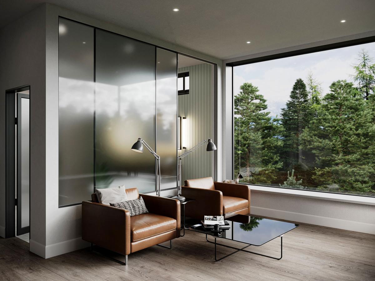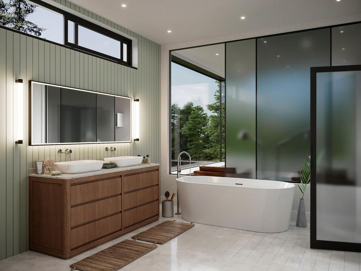 - Bath: Frosted glass shower, wall mounted toilets, sinks, faucets, and custom vanities.