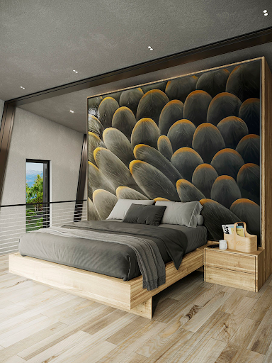 - Bath: Frosted glass shower, wall mounted toilets, sinks, faucets, and custom vanities.