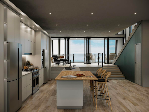 - Kitchen: Fully equipped including a combo microwave/convection oven, combo washer/dryer, full-sized refrigerator, dishwasher, and double induction cooktop, upper and lower cabinetry, sink and disposal
